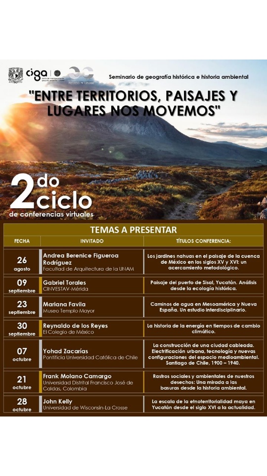 SEMINARIO Entre territorios, paisajes y lugares nos movemos Calificar entrada SEMINARIO de geografía histórica e historia ambiental Entre territorios, paisajes y lugares nos movemos. Agenda de agosto-octubre 2020 CIGA-UNAM, ENES Morelia